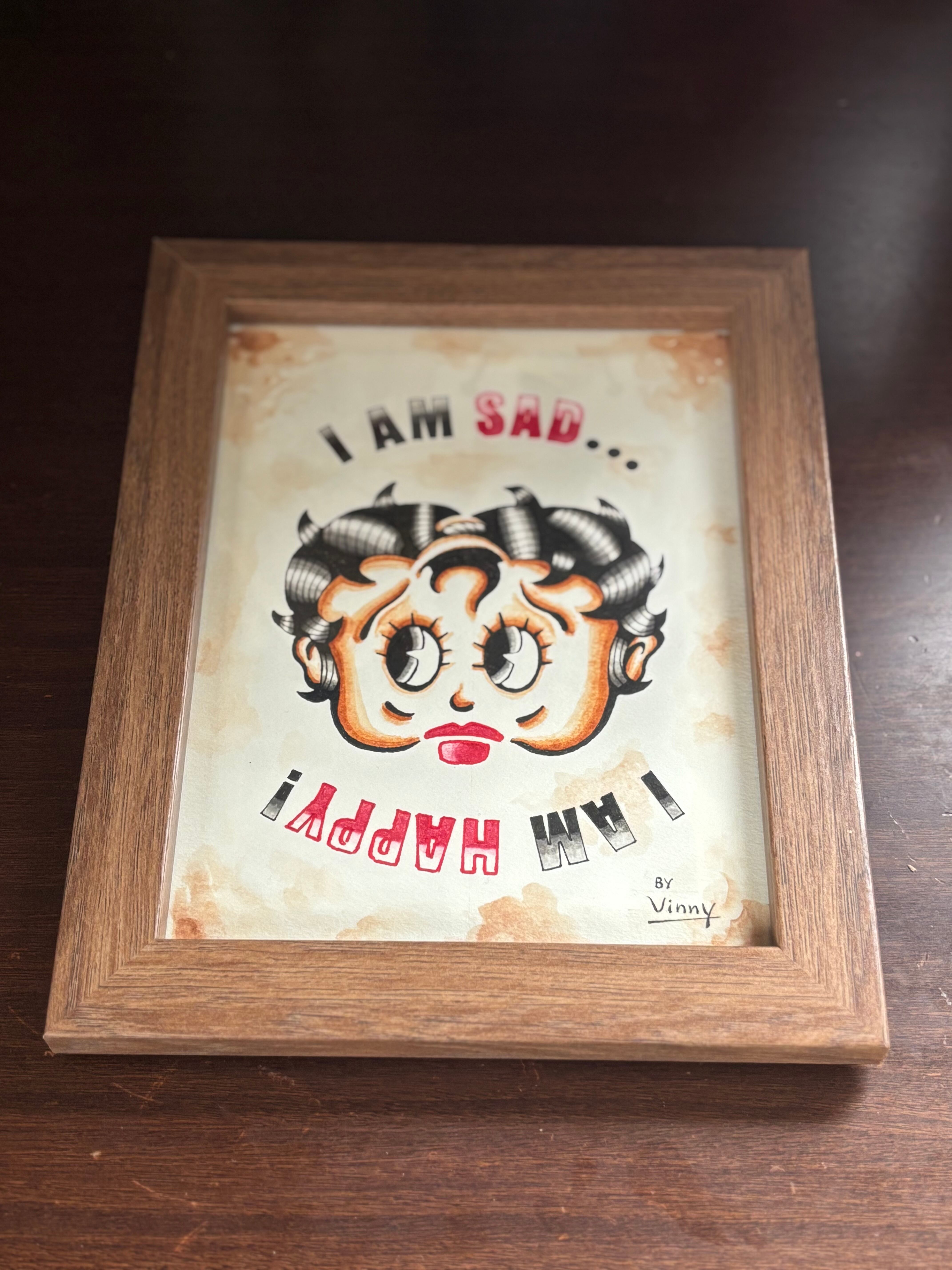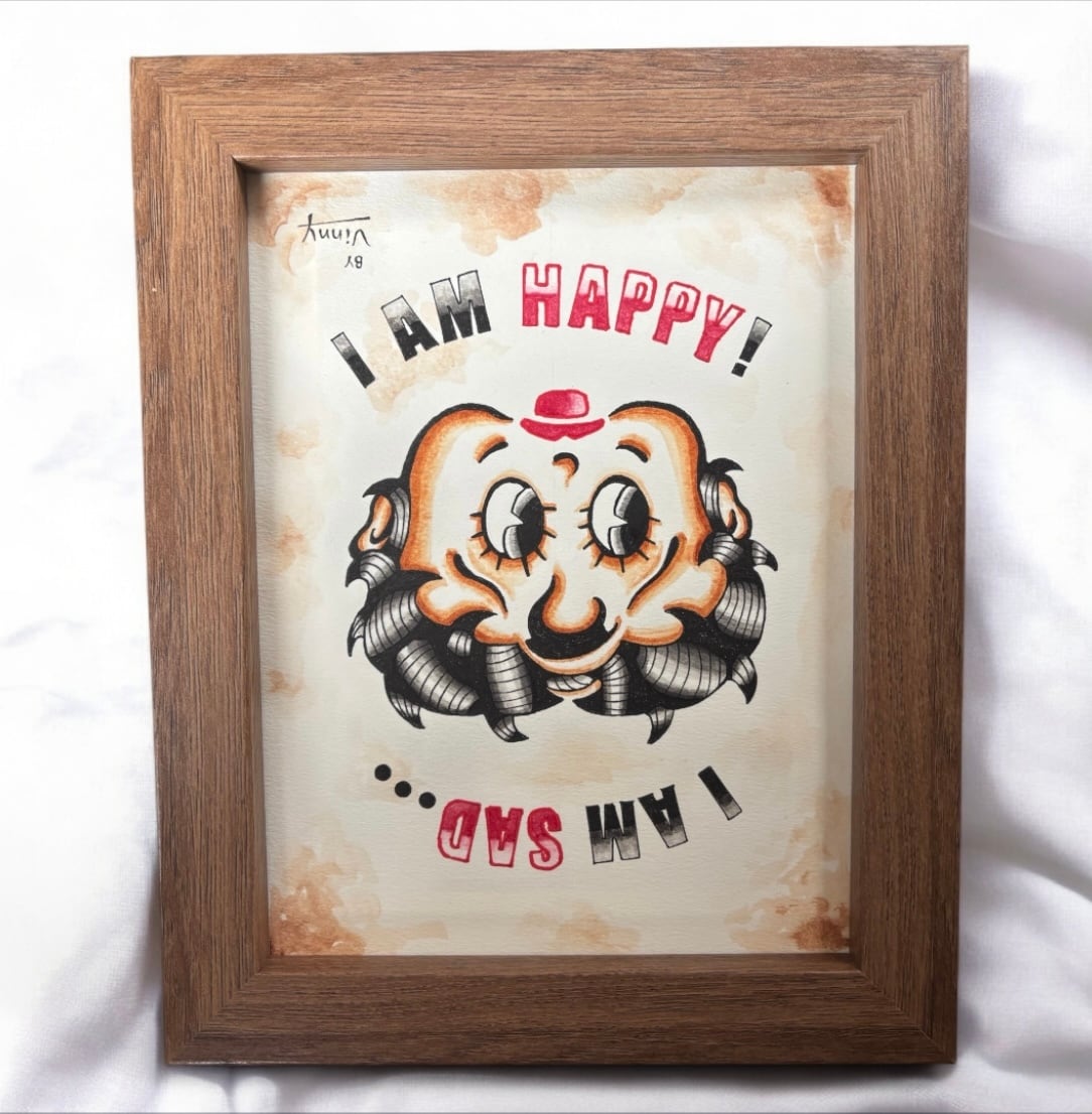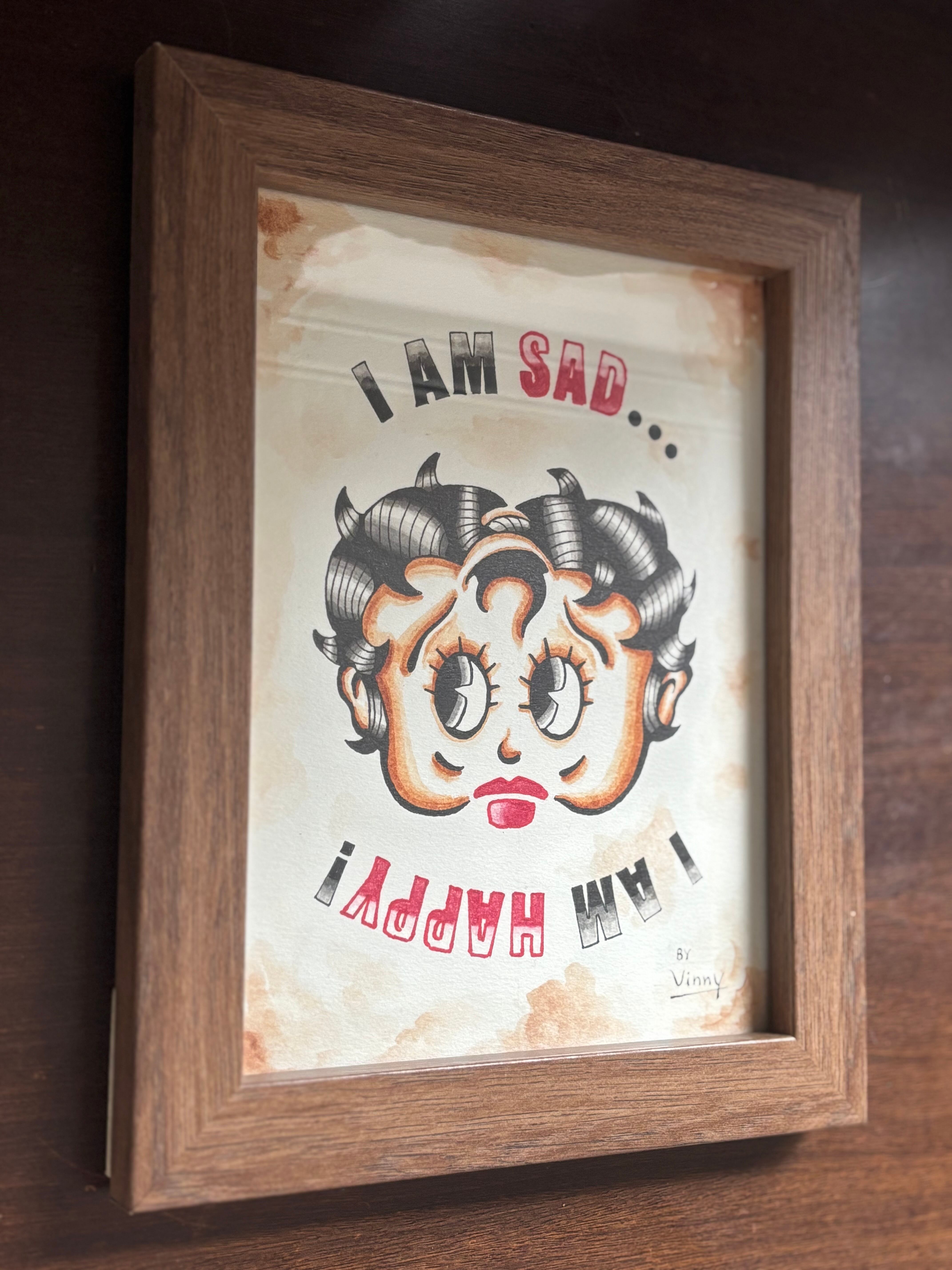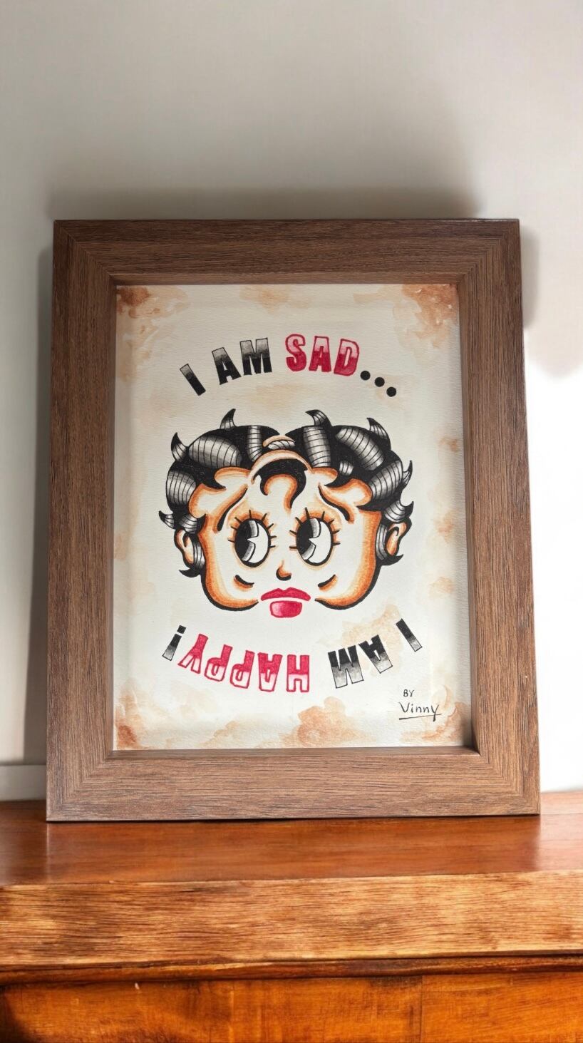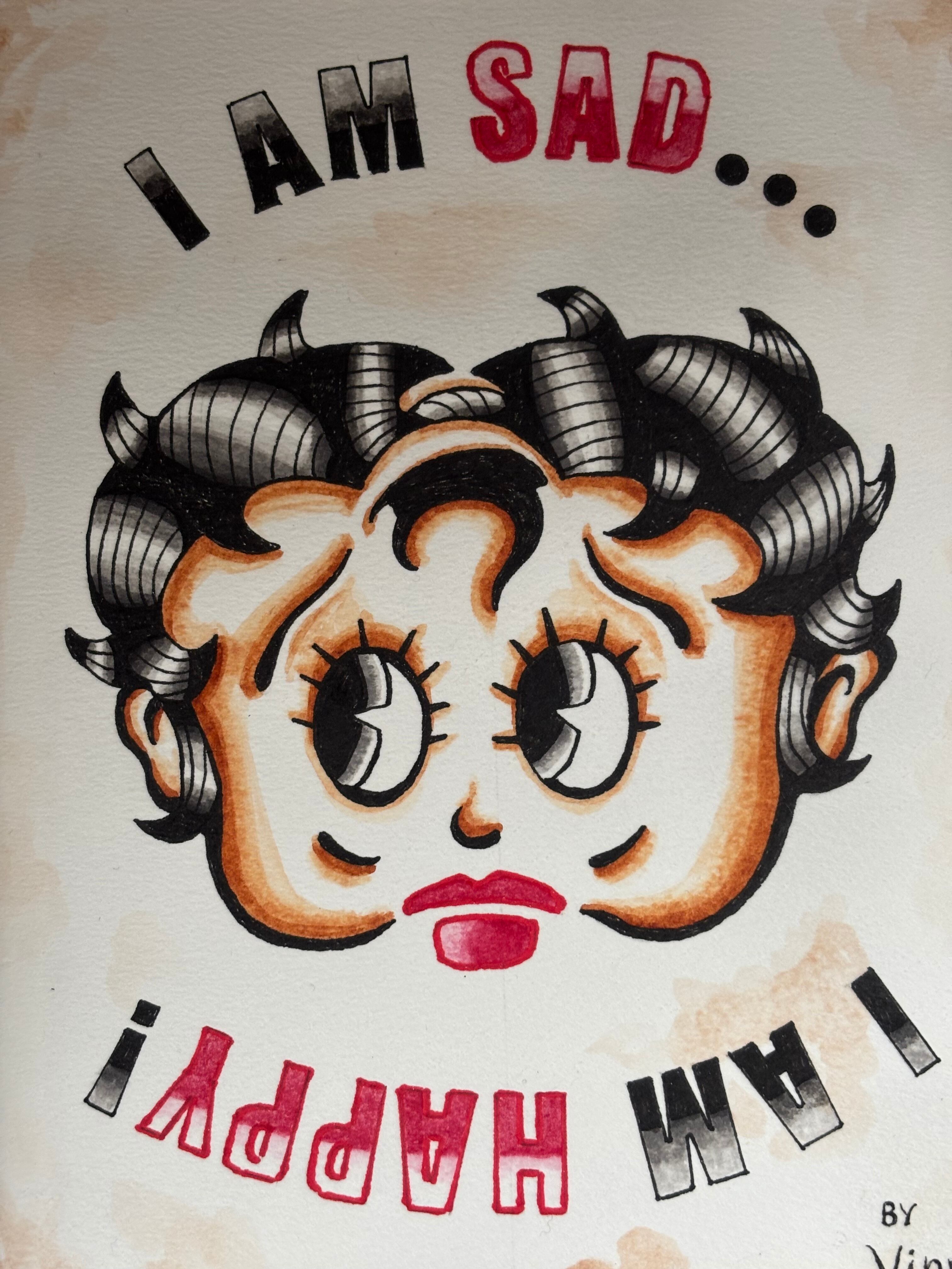 「SAD BETTY」と赤いハットが特徴の「HAPPY UNCLE」のいわゆる「逆さ絵」デザインです。